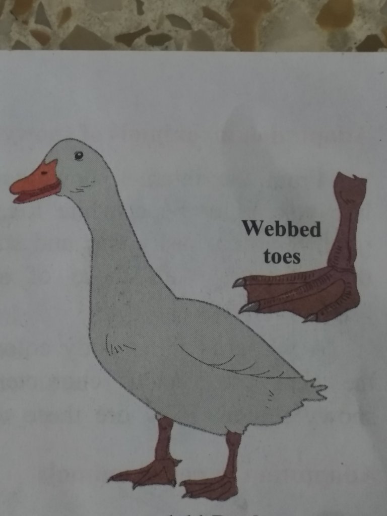 As the frog and duck have webbed toes, they can use their legs like oars. Waters flows off the waxy feathers of birds like duck and waterhen. Webbed toes, slippery, smooth skin and a triangular head help frogs to swim easily through water. They can live on land as well as in water due to their ability to breathe through the skin inn water and using the nose and lungs on land.